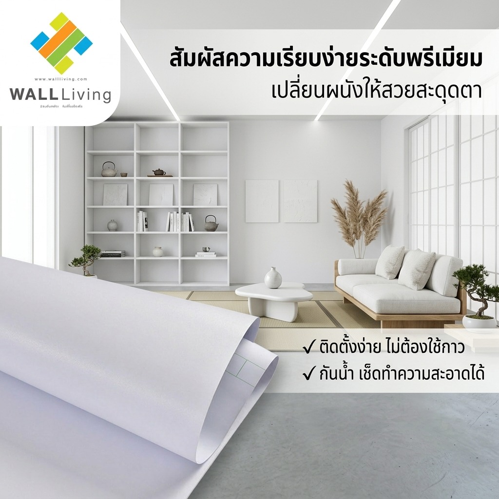 ในด้านวัสดุ วอลเปเปอร์สีขาวของร้าน Wall Living ผลิตจาก PVC หรือ Vinyl ซึ่งมีคุณสมบัติทนทาน กันน้ำ และทำความสะอาดง่าย อีกทั้งยังมีแบบสติ๊กเกอร์ (Peel & Stick) ที่ติดตั้งสะดวก สามารถทำเองได้โดยไม่ต้องจ้างช่าง เหมาะกับผู้ที่ต้องการรีโนเวทบ้านแบบรวดเร็ว